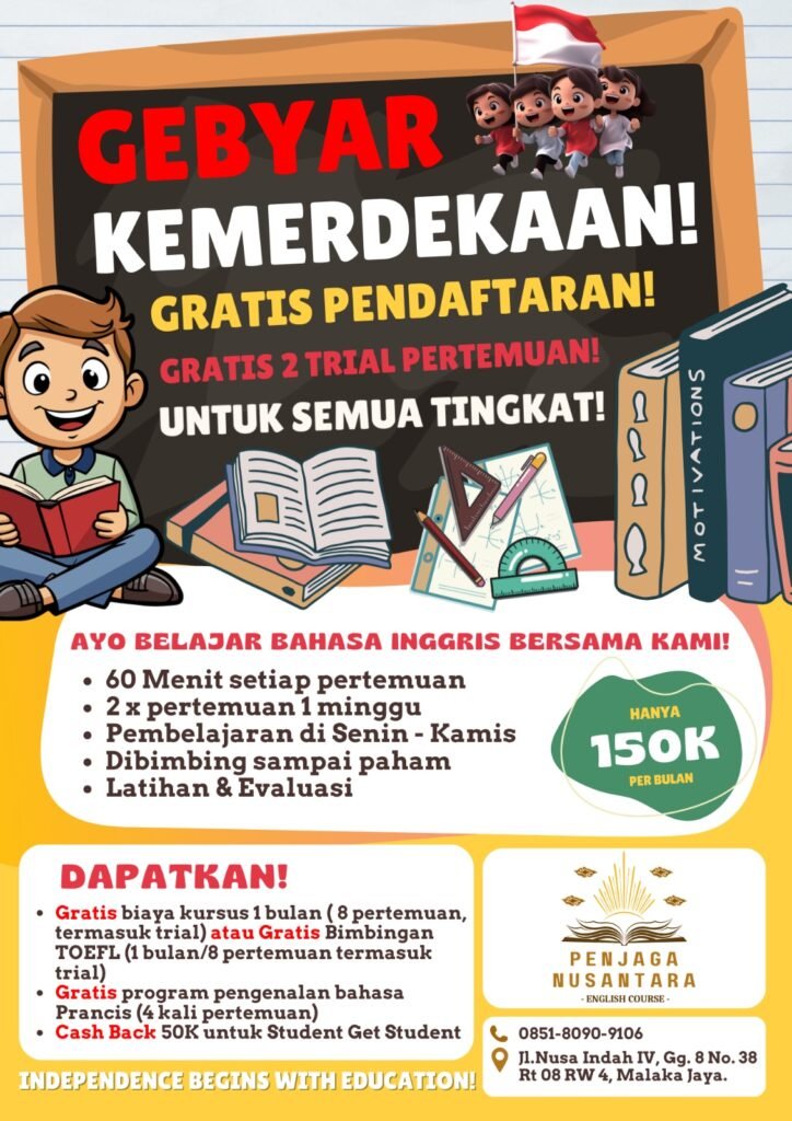 Dalam rangka memeriahkan Hari Kemerdekaan, Penjaga Nusantara English Course menghadirkan program spesial GEBYAR KEMERDEKAAN dengan penawaran yang sangat menguntungkan!